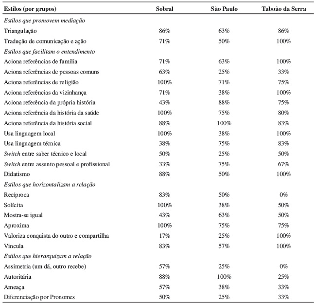 A análise da Tabela 7 leva às seguintes constatações: dos 24 estilos presentes em Sobral, cerca de 80% são usados por mais da metade dos ACS; em Taboão da Serra essa média cai para 60% e em São Paulo, onde há 22 estilos em uso, também aproximadamente 80% deles são comuns a mais da metade dos ACS.