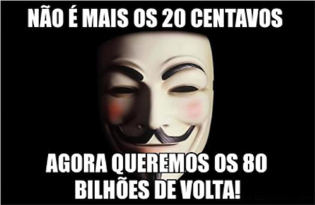 “Once upon a time, there was the Free Fare Movement, a movement with half a dozen communists that unintentionally has been able to trigger the outrage of all social classes. They have sold themselves and stopped. THE END! THE GIANT IS AWAKE AND WILL GO ALL THE WAY THROUGH SO THAT BRAZIL BECOMES A JUST COUNTRY!”