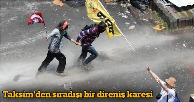 The pictures that circulated on TS’s page brought this diversity into focus. For example, Figure 5 shows two men, one holding a Turkish flag and the other the flag of the Peace and Democracy Party, which represented the Kurdish minority between 2008 and 2014. This image signifies the symbolic solidarity between nationalist and Kurdish forces during the protests against state violence and reads as “an exceptional moment of resistance in Taksim”. This solidarity, however, should not be read as finding a common language between Turks and Kurds. But it suggests to remember the violent past and forgotten injustices in order to alter the present relations between majority and minority groups. As such, this act of solidarity offers an illuminating example of protests as events. The disruption caused by the protests created a space for reflection and interpretation about the past and future of the Turkish-Kurdish conflict, which constitutes one of the most pressing political issues in Turkey.