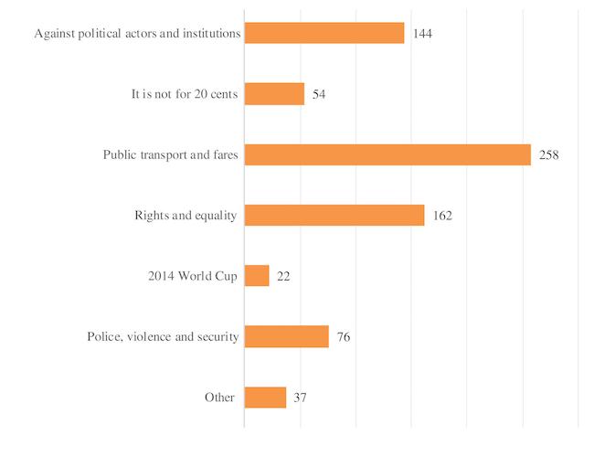 The Brazilian data shows clear symbolic struggles over different meanings attached to the protests. In the quest to explain the events while they were still happening, the actors engaged in the protests attempted to define what the struggles were about. A long list of issues were mentioned in Facebook posts in order to explain the causes. As the Chart 1 shows, the topic of public transportation and fares dominated the posts.
