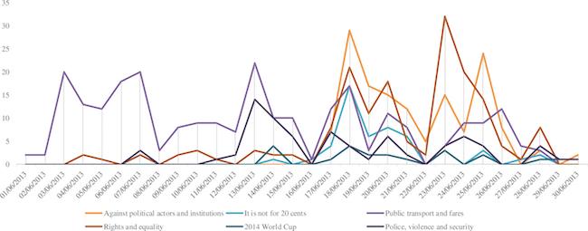Despite the preponderance of a particular cause that emerged in the Facebook posts, one can gain a more nuanced understanding of the possible rise and fall of particular causes by looking at this data across time. Chart 2 shows that the issue of public transportation and fares remains unchallenged until June 13, when the topic of police violence gains traction as an explanation for the protests. It should be noted that June 13 was a turning point in the Brazilian protests, as the police violence was broadly covered by the media and discussed by protestors.