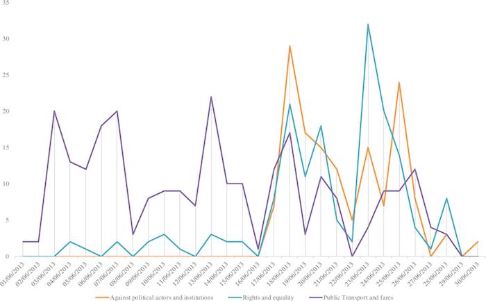 Around the same time, in Brazil, a complex process of massive protests emerged with Free Fare Movement calling citizens to march against the rise of public transportation fares in São Paulo in the beginning of June 2013 (Judensnaider et al., 2013; Maricato et al., 2013; Ricci & Arley 2014; Singer 2014; Gohn 2014; Scherer-Warren 2014; Bringel & Pleyers 2015; França & Bernardes 2016; Mendonça 2017; Bringel 2017). Police brutality, the visibility of the controversial Confederations” Cup,3 growing indignation with public expenditures and the political system, and a shift in the media coverage (from de-legitimation to support) are some of the key factors that enlarged the scale of the protests (Nogueira 2013; Nobre 2013; Ricci & Arley 2014). Fare increases were revoked in São Paulo on June 19, but the protests kept intense at least until the end of June and reached their climax on June 20, when more than two million Brazilians were on the streets in hundreds of cities and towns.