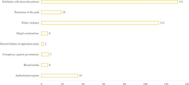 As noted, the majority of the posts that bring the causes of the protests to the fore steams from TS’s Facebook page. The most frequently articulated reason for the protests was “solidarity with those who protest”. These posts emphasized the need to show solidarity with the ones protesting on the ground, coming from various places both within Turkey and from abroad. The second widespread reason for the protests concerned the police violence against (peaceful) protesters. The third frequently mentioned cause was the authoritarian regime of the governing Justice and Development Party (JDP). The existing literature notes the increasing state oppression and authoritarian style of the government as significant reasons for the emergence and the proliferation of the Gezi Park protests (Abbas 2013; Gole 2013).