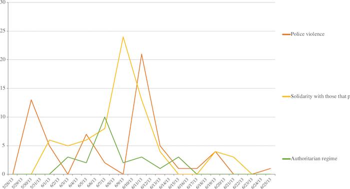As the Chart 7 shows, May the 30th was a turning point in Gezi Park protests.8 The number of posts emphasizing police violence increased drastically. This went hand to hand with the rise of posts expressing solidarity to protesters. The police intervention to the park with tear gas and water cannons and the destruction of protest tents on that day transformed protests from being a small-scale environmental protest into one of the biggest nation-wide movements in the history of the Turkish Republic. The initial reason of the protests, the removal of a handful of trees at Gezi Park to build a shopping mall, was dismissed as the cause of the subsequent upheaval. Instead, protesters began to emphasize the increasingly authoritarian policies of the government (Benhabib 2013). A post on June 6, for example, reads that “Three uprooted trees in Taksim Gezi Park turned into a struggle of democratic rights in all over Turkey”. A call for the “right to the city” turned into a call for the “right to live in a truly democratic country” (Taksim Solidarity’s page, June 6, 2013). Similarly, the press release published on this page on June 2 establishes the legitimacy of the Gezi Park movement by referring to PM Recep Tayyip Erdogan’s anti-democratic policies of restrictions on freedom of speech and the State’s interventions in individual life styles. In this press release, protesting is presented as a legitimate right of citizens against the state “which tries to instill a fear atmosphere in order to transform the whole society into a large prison through suppression, violence and force” (June 2, 2013). Tayyip Erdogan, who was the Prime Minister then, declined the use of force, claimed that he personally gave the order, and that he was proud of the police force’s work during the protests (Radikal 2013).