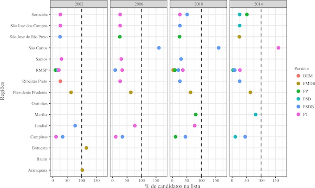 Em 2006, o PSDB teve comportamento um pouco desviante. O partido excedeu o total regional em cinco regiões diferentes: São Carlos, Santos, RMSP, Jundiaí e Campinas. Para os demais partidos, não muita coisa se altera. O PT excede em apenas uma, Santos; bem como o PMDB, em Bauru. O DEM lança mais que o potencial eleitoral regional em Bauru e Botucatu. Nos demais anos os partidos lançaram, majoritariamente, valor igual ou inferior ao potencial eleitoral de cada região.