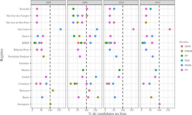 Vale afirmar que, temporalmente, não foi possível verificar uma dinâmica clara ou um padrão sobre se os partidos buscam “preencher”, com candidaturas, as regiões em que não atuavam anteriormente. Ainda assim, é possível afirmar que partidos respondem à lógica das regiões do estado para contornar a competição intrapartidária em cada eleição.