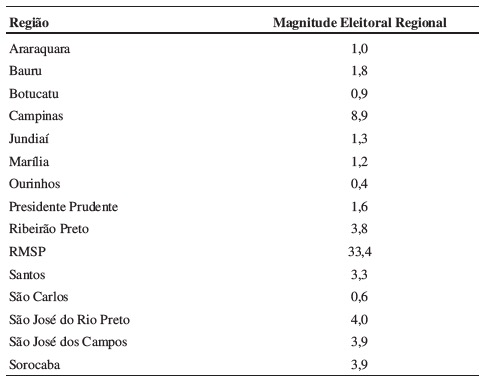 em que Vvrd é a quantidade de votos válidos na região r e QEd é o quociente eleitoral do distrito d. Considerando a distribuição do eleitorado e a magnitude M = 70 (São Paulo), cada uma das regiões tem definido um valor que representa, em teoria, o número potencial de deputados eleitos para cada uma dessas regiões. Em outras palavras, a Região Metropolitana de São Paulo (RMSP) elegeria, em média, 33 deputados dos 70 totais eleitos no estado se a distribuição de eleitos fosse proporcional à distribuição de eleitores. A Tabela 1 ilustra tal relação.