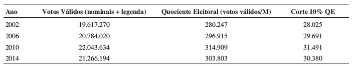 O Critério 1 é bastante restritivo, sobretudo quando se considera o quão difícil é eleger um deputado federal no Brasil, bem como a baixa taxa de reeleição no país. Há custos financeiros, partidários, humanos e, claro, demanda por conquista de votos. Tal critério pode, portanto, excluir da análise candidatos cujos partidos possam considerar potencialmente competitivos. Assim, ao atenuar o critério de competitividade pretende-se verificar se, ainda assim, faz sentido a hipótese de que partidos lançam listas otimizadas regionalmente, evitando a competição intrapartidária incentivada pela lista aberta e as elevadas magnitudes. Dado que a obtenção de cadeiras por um partido é condicionada ao cálculo do QE, escolheu-se uma parcela dele para definir quais candidatos podem ser considerados competitivos. O corte utilizado foi de 10% do quociente eleitoral, conforme a Tabela 2.