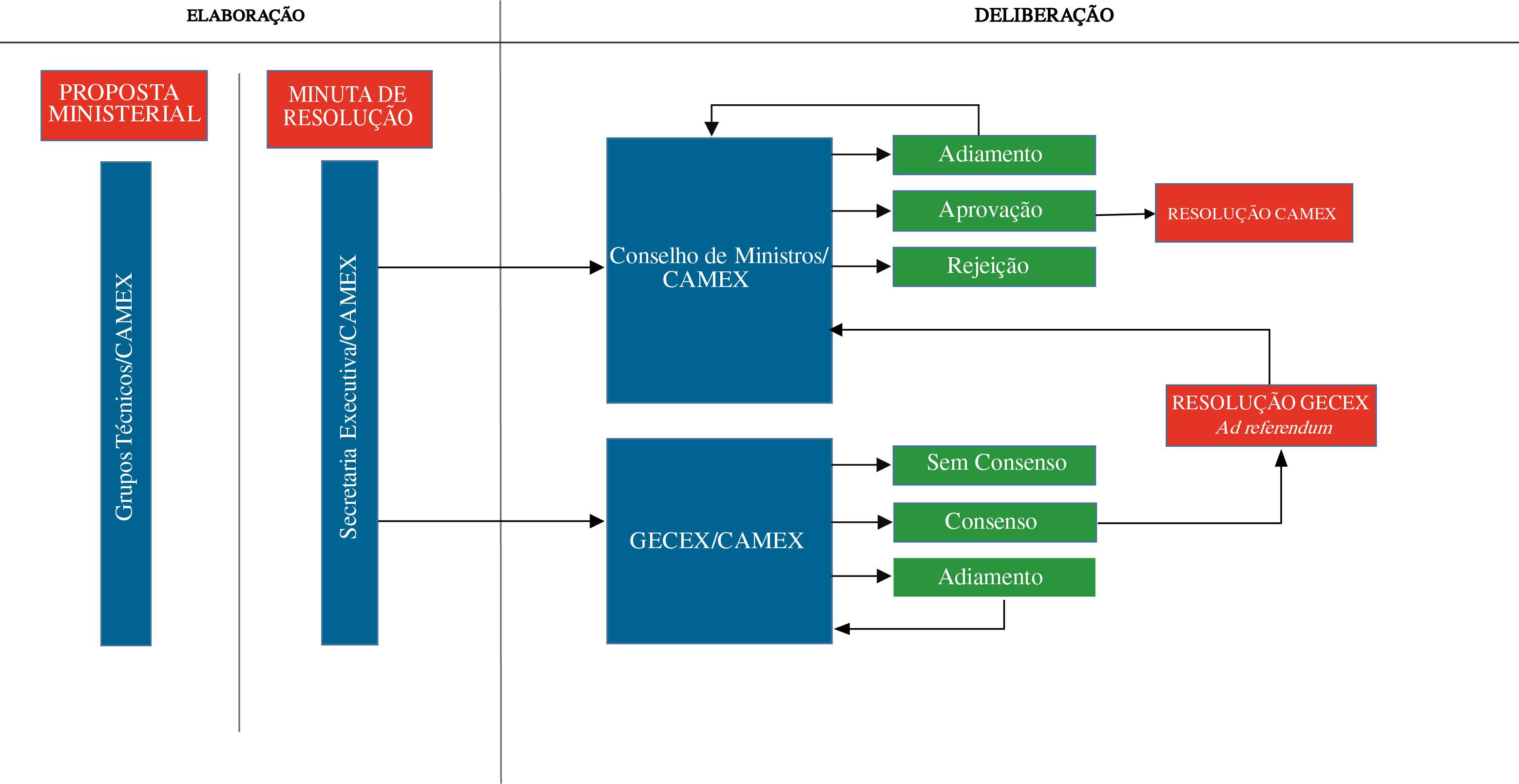 Os ministros enviam as propostas à SE/Camex, que encaminha para um dos Grupos de Trabalho (GTs) especializados. Em seguida, a proposta é encaminhada ao Gecex ou ao Conselho. As propostas dirigidas ao Gecex são as que o Conselho já se pronunciou em casos semelhantes, estabelecendo uma dinâmica própria. O Conselho pode retomar ou rejeitar a medida. Embora haja mais membros do que no Conselho, as decisões no Gecex são tomadas por consenso. Sem consenso, a medida é encaminhada ao Conselho. Somente este, onde as medidas são tomadas por maioria, pode rejeitar uma medida. Vale mencionar que, nas atas as reuniões usadas para este trabalho, não há registo de atrito entre o Gecex e o Conselho. A linha decisória da Camex está esquematizada na Figura 1.