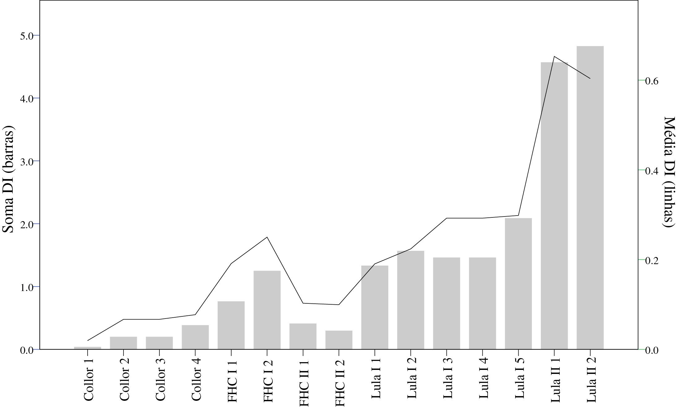 As distâncias ideológicas (DI) são obtidas pela distância euclidiana entre a posição de um partido e o partido do presidente. O lado esquerdo do Gráfico 1 corresponde ao das barras, que indica a soma das distâncias de cada coalizão, enquanto o lado direito, da linha preta, se refere à média das distâncias de cada coalizão8. O Gráfico 1 qualifica ainda mais a complexidade da coalizão (Batista 2014). Como essa complexidade afetaria a Camex?