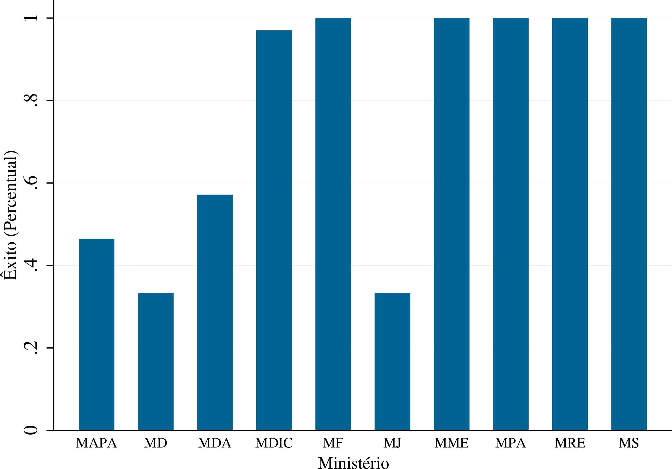 O Gráfico 3 confirma o viés a favor do êxito e, em particular, ao MDIC (96,98% de êxito). Sobre o total de demandas de cada ministério, o êxito se reparte de maneira desigual, em que certos ministérios ganham mais do que outros de forma desproporcional. Os ministérios que mais perdem são MAPA (êxito em 46,42% das propostas), MDA (57,14%), MJ e MD (ambos com 33,3%). Curiosamente, ministérios ligados à agricultura são menos privilegiados que os demais.