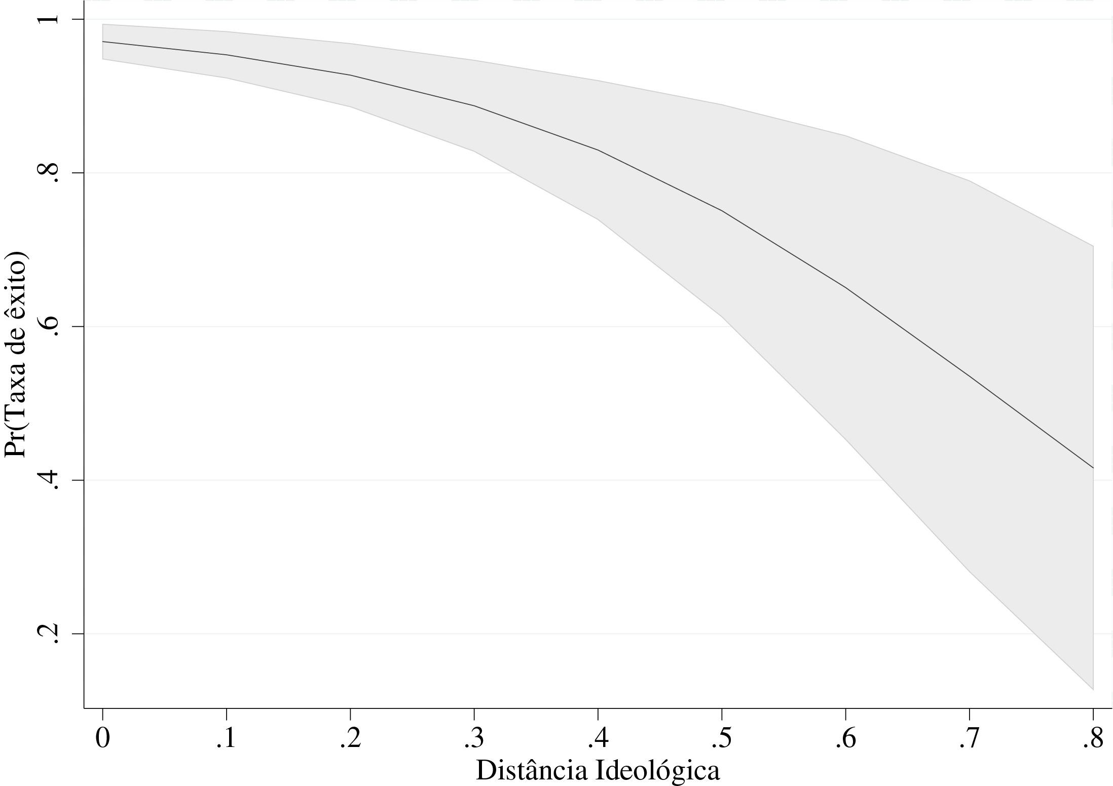A Gráfico 4 foi obtido em função da regressão logística convencional (Tabela 2). Há de fato uma relação negativa entre a distância ideológica e a probabilidade de êxito dos ministros. Por outro lado, o intervalo de confiança, que se expande à medida que a distância ideológica aumenta, confirma o viés a favor do êxito e do MDIC: há menos casos com fracassos de iniciativas de ministros mais distantes ideologicamente do presidente do que casos de êxito de propostas de ministros mais próximos, ou até do mesmo partido.