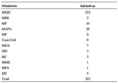 Ao total, foram levantados 292 casos. Há claramente um viés a favor do MDIC na iniciativa de propostas, o que talvez se deva às escolhas metodológicas. Vale mencionar também que muitas das iniciativas do MDIC são revisões obrigatórias da Letec e pareceres de demandas de grupos de interesse. Também se destacam as propostas de outros ministérios, além dos membros permanentes do Conselho da Camex: Ministério da Defesa (MD), Ministério da Justiça (MJ) Ministério de Minas e Energia (MME), Ministério da Pesca e Aquicultura (MPA) e Ministério da Saúde (MS). Os ministros participam das reuniões, mas não fica evidente se fazem parte do processo decisório. Outro ponto que vale ressaltar é a escassa participação do MRE, MP e da Casa Civil. Se por um lado as participações desses ministérios possam estar atreladas aos assuntos que a LAI não permite acesso, por outro, os ministros dessas pastas levantam diversas oposições às propostas de outros ministros.