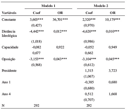Em todos os modelos estão dispostos os coeficientes de regressão e os odd ratios (OD) (razões de chance), que indicam as probabilidades de maneira mais clara: quando os ODs são inferiores a 1, a relação é negativa, e um aumento de uma unidade na variável independente diminui a probabilidade de êxito em p = 1 - β, isto é, 99,9% no Modelo 2 para a distância ideológica (p = 1 -0,008).