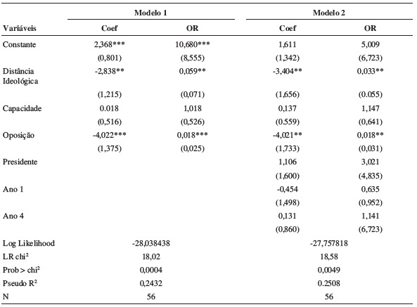 A Tabela 2 mostra a regressão logística convencional. O Modelo 1 corresponde a um teste de robustez do Modelo 2, em que se verifica o impacto das variáveis independentes sem as variáveis de controle, que confirma os achados empíricos. De fato, o Modelo 2 confirma a Hipótese 1, sobre distância ideológica, demonstrando resultado negativo significativo, conforme esperado. A variável de capacidade não obteve significância. Um achado interessante se refere ao resultado da variável de oposição que, como esperado, obteve resultado negativo e significante. No Modelo 3, testou-se uma variável de interação entre distância ideológica e capacidade técnica, que não trouxe achados importantes.