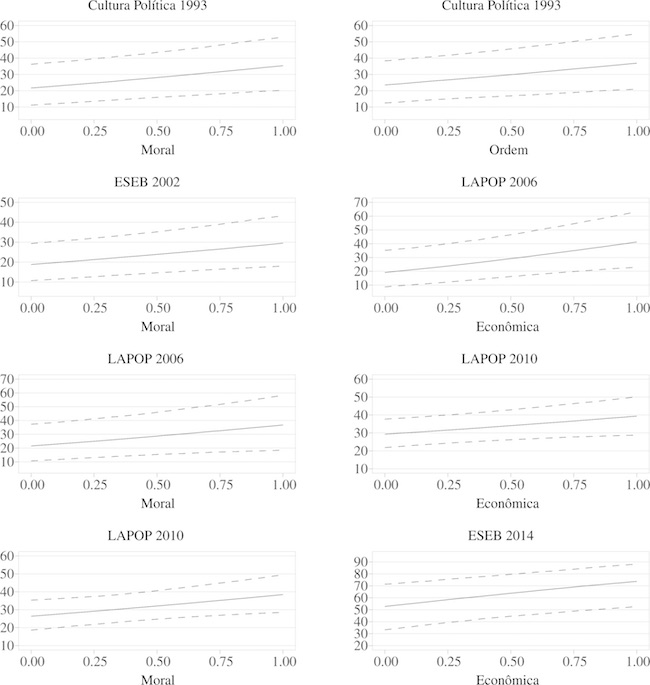 De resto, as pesquisas apreciadas foram o Estudo Eleitoral Brasileiro (ESEB) de 2002 e de 2014, e o Barômetro das Américas (LAPOP), versões 2006 e 2010. Assim, contemplo 70% do total de eleições da República fundada em 1988. Cabe informar que os itens não se repetem com a mesma configuração nos anos subsequentes, o que dificulta um pouco as medidas de comparabilidade.