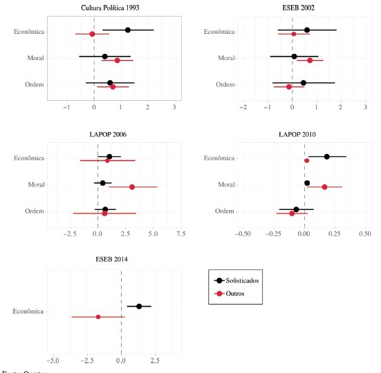 Os efeitos preditos das regressões constam na Figura 2. Nela, aparecem as diferentes dimensões, organizadas por ano, ponderadas de acordo com a sofisticação dos entrevistados. Grosso modo, verifica-se a disparidade observada entre as duas categorias. Controlando os demais fatores, os mais sofisticados normalmente privilegiam a dimensão econômica como bússola para a orientação do voto para presidente, ao passo que os menos sofisticados se ancoram em conceituações morais e, excepcionalmente em 1993, relativas à ordem. O único ano em que os grupos observados coincidem na influência dos issues destacados é na eleição de 2010, embora a magnitude do efeito seja um tanto díspar entre os dois perfis.