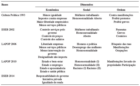 Quanto às questões de posição, segui a dimensionalidade proposta por Silva (2016), fundamentada em três âmbitos independentes – exceto no ESEB de 2014, em que o questionário permite o agrupamento somente da dimensão econômica. Os itens elencados12 foram fatorializados e os parâmetros estimados via mínimos quadrados ponderados com erros-padrão robustos. Adotou-se as funções ordenadas e probit nos modelos de análise fatorial, tendo em vista que a maioria dos itens é categórica. Nos modelos multidimensionais, optei por um ajuste que autoriza a correlação entre as dimensões (rotação oblimum), em vez de um arquétipo ortogonal. Os fatores latentes possuem escala variância de 1 e os valores mais elevados indicam orientações conservadoras nas respectivas dimensões. Na esfera econômica, “ser conservador” significa apoiar mecanismos pró-mercado; na social, dar suporte a posições contrárias às liberdades comportamentais; e, quanto à ordem, endossar um discurso de oposição às manifestações populares. A Tabela 1 oferece um panorama dos itens selecionados nas diversas bases.