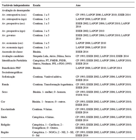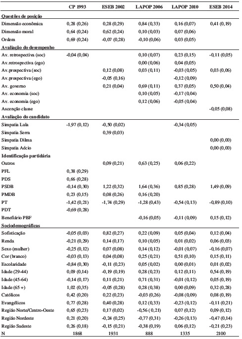 Materiais e Métodos: A pesquisa está assentada em análises econométricas e psicométricas de dados coletados nas eleições presidenciais brasileiras – no Datafolha, ESEB e Lapop -, de 1989-2014. Para tanto, verificou-se a validade do arrazoado mediante o exame de uma possível associação entre os posicionamentos políticos e o voto, ao longo dos anos considerados.