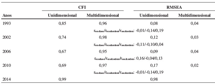 As medidas de ajuste da análise fatorial encontram-se na Tabela 3. Em todos os anos, os postulados multidimensionais aparecem com valores de CFI acima do mínimo aceito (0,90) e de RMSEA abaixo de 0,05, considerado o limite desejável (Fabrigar et al., 1999; Reise et al., 2000). As baixas taxas de correlação dos fatores (< 0,02) reforçam a validade do enquadramento. Os coeficientes padronizados, exibidos no Apêndice, rodam com magnitudes consideráveis nos fatores delimitados (sempre superiores a 0,4), reforçando a estruturação multidimensional dos preceitos políticos.