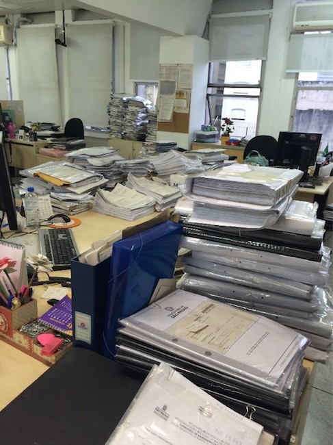 Os processos administrativos são abertos por motivação da própria administração pública ou a partir de solicitações de pessoas físicas e entes externos. Em sua versão analógica, são formados por uma pasta de papel com capa protetora que reúne, cronologicamente, documentos, tais como requisições, memorandos, publicações e e-mails, com informações requeridas, obrigatórias e relevantes, produzidas ou não para seu fim. Sua produção é uma atividade coletiva, construída pela circulação por diversas unidades que a ele juntam novos documentos, complementando a história que nele se registra. Trata-se de uma presença bastante marcante nas burocracias da camada intermediária (mesmo com o processo eletrônico, circulam processos legados pelas mesas), como mostra a Figura 1.