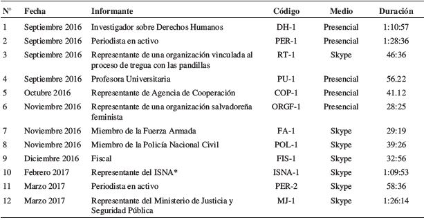 Materiales y Métodos: Se trata de una investigación cualitativa apoyada en 12 entrevistas y el relato de vida con las que se explora la responsabilidad gubernamental frente al problema de la violencia en El Salvador. El trabajo de campo se efectuó durante 7 meses, entre septiembre de 2016 y marzo de 2017. El tratamiento de la información se efectuó mediante software MAXqda 12.