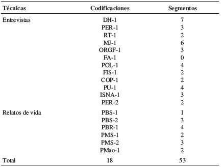 El tratamiento de la información se efectuó mediante software de tratamiento cualitativo MAXqda 12. Se establecieron dos estructuras de análisis, a partir de texto y concepto. Ello permitió la construcción de redes discursivas y la lógica articulación compleja integrando los niveles de abstracción. Utilizamos el modelo de intersección crítica de categorías (Wodak & Meyer 2009) recogidas en segmentos explicativos o de alusión a ellas, tal como los informantes clave verbalizaron. Se trabajó con 317 segmentos que referenciaron las categorías extraídas tanto de las entrevistas como de los relatos de vida; algunos de ellos, se incorporaron al presente trabajo (Tabla 3).