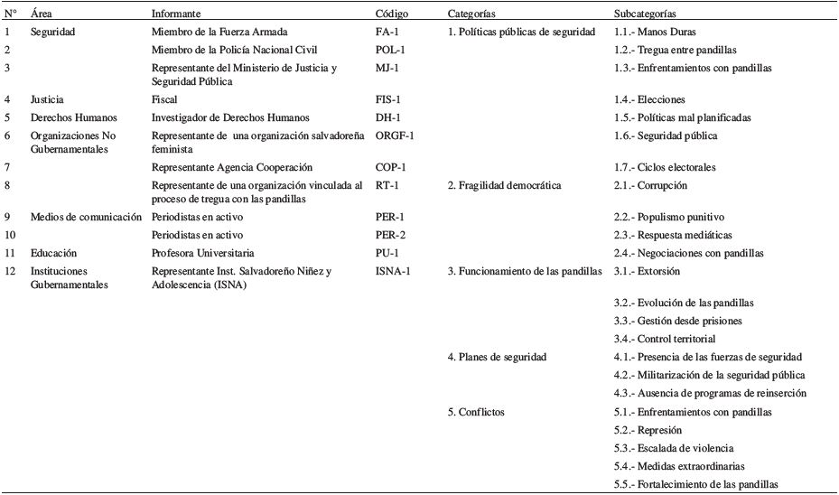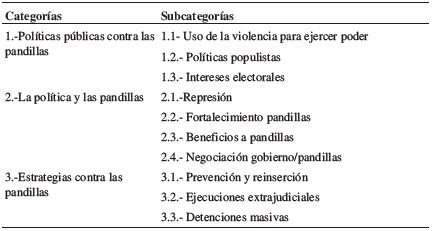 El proceso de categorización se articuló a partir de la propuesta de Patton (1990), realizando entrevistas apoyadas en un guion que abordó distintas áreas de conceptuales y que posteriormente se diseccionaron en categorías y subcategorías de análisis. Esta preservación se moduló en ambas técnicas. Con este objeto se secuenciaron las siguientes categorías: políticas públicas de seguridad, democracia estructural, pandillas - ideologías y violencias, seguridad pública, propuestas de solución y reinserción. Para este artículo, presentamos las cinco primeras que mostramos en el cuadro descriptivo (Tabla 4 y Tabla 5).