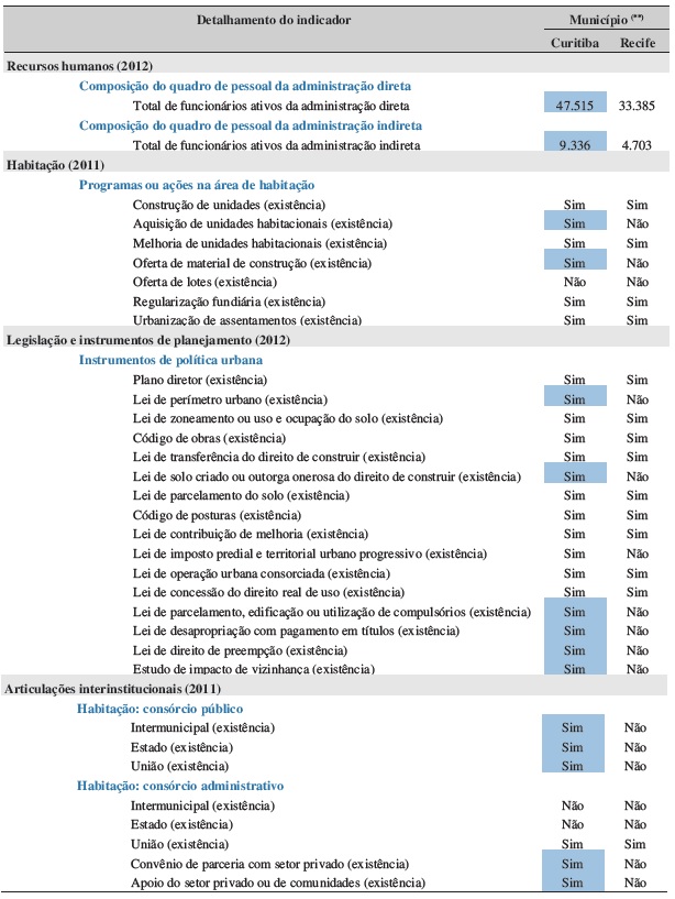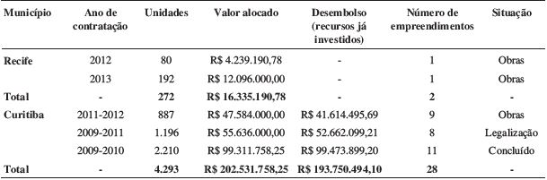 No que diz respeito, então, à caracterização mais geral do contexto habitacional, em Recife, a proporção de domicílios com déficit habitacional sobre o total de domicílios em 2012, para a região metropolitana, era de 8,2% (IPEA 2013), e o percentual de domicílios em assentamentos precários, de 17,64% em 2000 (Marques et al., 2008). Já em Curitiba, o déficit da região metropolitana relativo ao número total de domicílios, em 2012, era de 6,5% (IPEA 2013), e o percentual de domicílios em assentamentos precários, em 2000, de 12,13% (Marques et al., 2008).