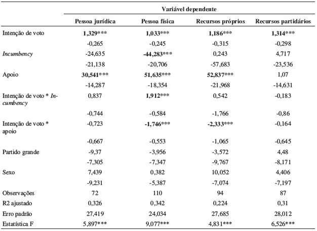 Resultados: Os resultados atestam o impacto positivo das intenções de voto aferidas nas sondagens pré-eleitorais e do apoio do governador sobre as arrecadações totais. Já ser mandatário e candidato à reeleição (incumbency) foi um fator ineficaz para a explicação de quase todas as receitas.