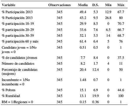 Territorialmente, Chile está constituido de 345 municipios agrupados en quince regiones. Para las elecciones legislativas de 2013 el país estaba compuesto por 60 distritos. Dada la vigencia del sistema electoral binominal, cada distrito elegía 2 representantes. La Tabla 1 reporta los estadísticos descriptivos de las variables a utilizar que están disponibles para nuestras 345 unidades. Subrayamos que las variables medidas en porcentaje están ponderadas según el tamaño del padrón electoral o del censo según sea el caso. Dado que en Chile existe una amplia variación en el volumen de habitantes y electores por comuna, el no ponderar los casos puede traer serios problemas en las estimaciones. No es lo mismo un 40% de participación electoral en una comuna de 300.000 electores en comparación con una comuna de sólo 2000 electores.
