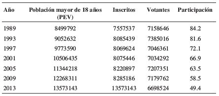 Respecto a la variable dependiente, la participación electoral en los comicios legislativos de 2013- que fueron concurrentes con la primera vuelta presidencial- sobrepasó levemente el 49%. Estas elecciones se desarrollaron bajo el régimen de voto voluntario, cuyo estreno fue para los comicios locales de 2012. La Tabla 2 detalla la información de la participación electoral desde 1989. Si en los comicios para diputados de 2009- bajo el voto obligatorio- la participación alcanzó un 58.5% tomando como universo al total de la población en edad de votar y no sólo a los inscritos en los registros electorales, en 2013 el retroceso fue de casi 10 puntos. Esto no reviste mayor novedad pensando en que sistemáticamente la participación electoral en países con voto obligatorio es superior a la de países con voto voluntario. La pregunta- para nuestro caso de estudio- es si las variaciones comunales de participación fueron homogéneas o si respondieron a algún patrón.