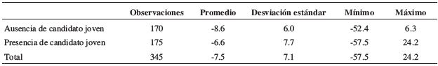 Complementamos el estudio con otro indicador que corresponde al porcentaje de candidatos jóvenes. Dado que este indicador está correlacionado con la presencia o ausencia de candidatos jóvenes, lo ocupamos en modelos estadísticos independientes. Creemos que esta variable captura de manera más global el atributo de la “oferta juvenil”.