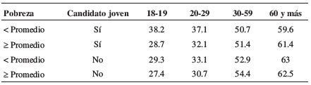 Resultados: Concluimos que la presencia de candidatos jóvenes (de 30 años o menos) estimula la participación de electores de 18 a 29 años, siendo irrelevante en electores de 30 a 59 años, y deprimiendo la participación en electores de 60 años y más.