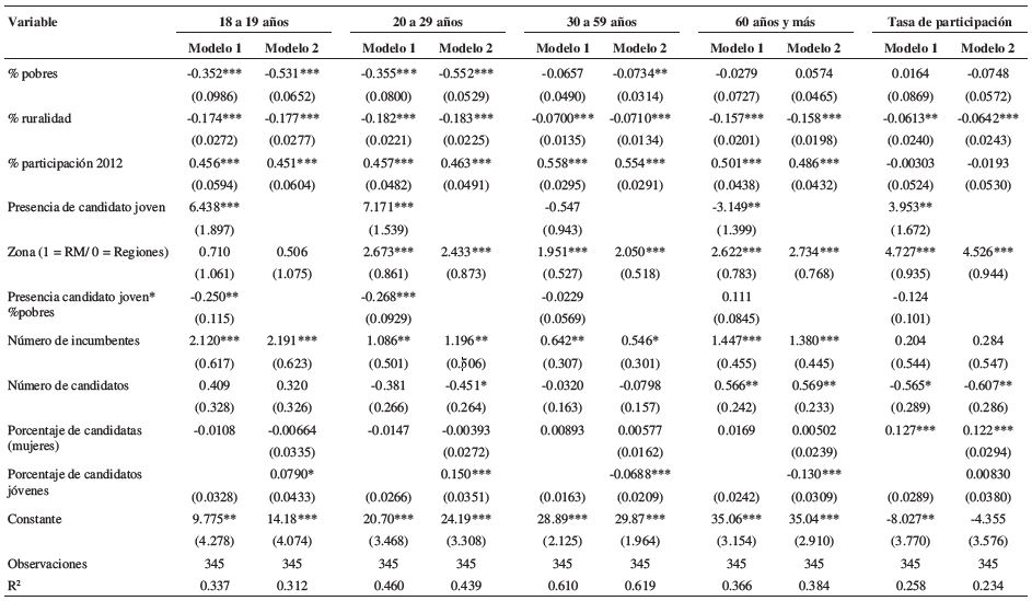Las bases del análisis descriptivo nos permiten identificar las variables más adecuadas para construir los modelos estadísticos. Hemos optado por el método de los mínimos cuadrados ponderados (WLS) a fin de que las comunas tengan un peso relativo dentro del modelo equivalente a su volumen poblacional. Como señalamos más arriba, utilizamos como variable dependiente dos indicadores: el porcentaje de participación por grupo etáreo, y la tasa de variación de la participación electoral 2009/2013. La variable independiente central es la presencia o ausencia de al menos un candidato joven (30 años o menos). Subrayamos que el modelo no incluye información específica de cada candidato, pero sí sabemos que de los 46 candidatos jóvenes, no hubo incumbentes. Algunos de estos candidatos jóvenes fueron dirigentes estudiantiles que destacaron en las movilizaciones sociales de 2011. Sin embargo, es difícil aislar su efecto, pues las candidaturas de estos líderes abarcaron sólo diecisiete de las 345 comunas. De todos modos, al ejercitar algunos modelos aislando a los ex dirigentes estudiantiles del resto de los candidatos jóvenes, los resultados no muestran grandes variaciones.