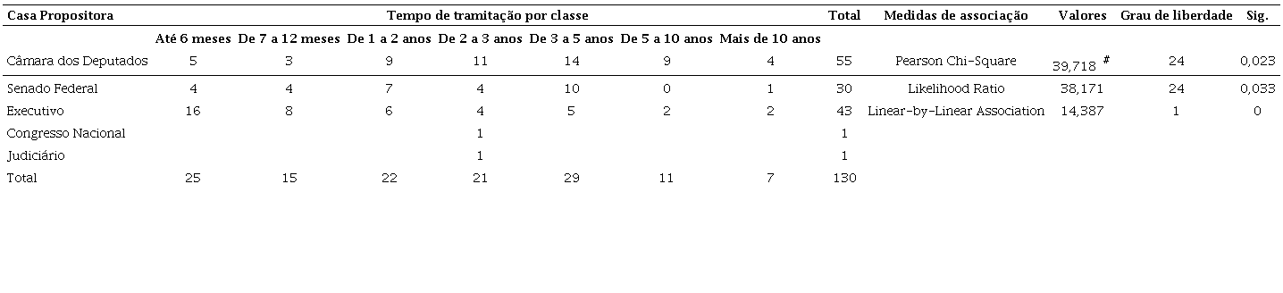 Por esses dados, pode-se dizer que houve uma forte associação entre casa propositora e tempo de tramitação: as leis propostas pelo executivo tramitam mais rapidamente que as leis de iniciativa do poder legislativo. À medida que o tempo de tramitação aumenta, o número de leis aprovadas originárias do Executivo diminui. O que se correlaciona com a nossa hipótese inicial, de que estas leis são aprovadas mais rapidamente do que as propostas originárias do Congresso Nacional.