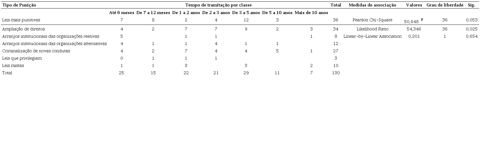 De acordo com a Tabela 3, podemos inferir uma associação (ainda que mais moderada que a anterior) entre os tipos de punição e tempo de tramitação: leis mais punitivas são aprovadas mais rapidamente do que todos os outros tipos de leis pesquisados. Sete das leis recrudescedoras foram aprovadas em até 6 meses e oito leis aprovadas de 6 a 12 meses. O que, certamente, caracteriza uma legislação penal de emergência, repressiva e punitivista. Por outro lado, as leis que ampliam direitos – universalistas - tramitam majoritariamente de 1 até 5 anos. Há, portanto, uma afinidade entre leis mais punitivas, tramitação rápida ( urgência) e a restrição de direitos e garantias fundamentais dos acusados.