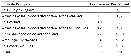 Discussão: Os tipos de punição indicam que a política criminal é definida pela sua dualidade entre princípios hierárquicos e princípios universais de cidadania, ora ampliando, ora restringindo direitos e garantias fundamentais dos acusados; assim como é marcada também pela expansão do Direto Penal nas diferentes áreas da vida social.