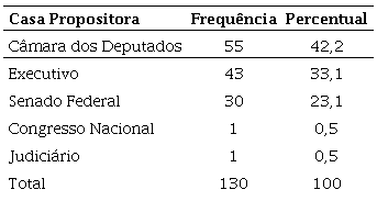 No entanto, a análise ampliada até o ano de 2016 sobre os projetos que deram origem às leis sancionadas em segurança pública e justiça criminal atesta a dominância do Legislativo sobre o Executivo nessa temática, sobretudo, a partir dos governos Lula e Dilma. A Tabela 5 revela que 42,2% da legislação em segurança pública e justiça criminal é de origem da Câmara dos Deputados (55 leis), 33,1% (43 leis) é de origem do Executivo e 23,1% foram projetos de autoria do Senado Federal (30 leis). A iniciativa conjunta do congresso nacional aprovou apenas uma lei 11, assim como o poder judiciário 12.