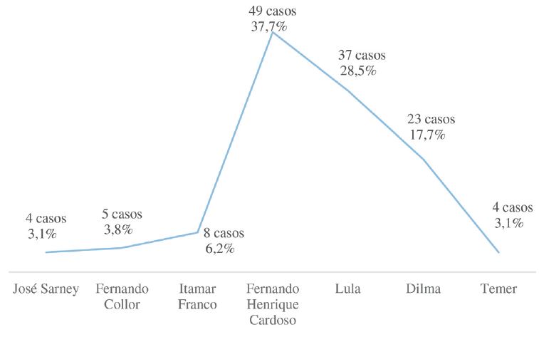 Pensar na influência partidária da coalizão na aprovação de leis de segurança pública e justiça criminal de um governo é pensar que os governos FHC, Lula e Dilma, especialmente nos primeiros anos e dos primeiros mandatos, foram capazes de exercer uma influência importante sobre a organização do sistema partidário no que diz respeito à coalizão governamental, o chamado presidencialismo de coalização ( Abranches 1988; Limongi 2006). O que pode ter refletido no número de propostas sancionadas em segurança pública e justiça criminal ( Gráfico 2): 49 leis nos mandatos de FHC, 37 leis nos governos Lula e 23 nos mandatos da presidenta Dilma. O menor número da legislação aprovada na temática já nos governos Dilma, particularmente após o ano de 2012, pode ser explicado pela dificuldade da presidenta em manter a coalizão em torno do seu governo. O que, inclusive, foi um dos fatores que resultou no seu afastamento.