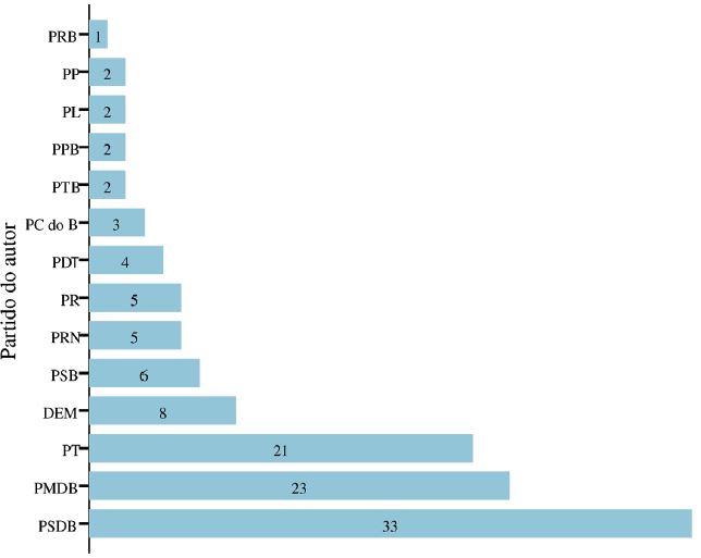 Sobre o espectro político-partidário dos propositores dos projetos e propostas em segurança pública e justiça criminal sancionadas partidárias os dados referem-se aos projetos de lei com origem na Câmara dos Deputados, no Senado Federal e ao Executivo (considerando o partido de pertencimento partidário do presidente). O que totalizou 117 iniciativas oriundas especificamente do Congresso Nacional e Executivo com a vinculação partidária. Das 130 propostas 13 não foram classificadas pelo pertencimento partidário porque são originarias de CPIs (Segurança Pública, Extermínio de Crianãs e Adolescentes, etc). Os dados à respeito do espectro político-partidário dos autores e autoras das propostas de leis sancionadas estão expostos no Gráfico 3.