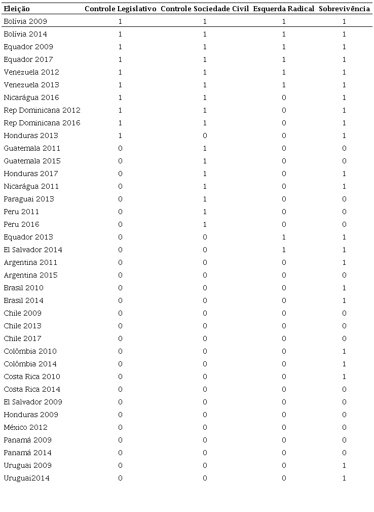 Tampouco somos capazes de identificar causas necessárias para a vitória eleitoral dos chefes do Executivo dentre as variáveis que entraram na análise. Na equação (2), isto é evidenciado pela ausência de uma condição presente em todas as combinações possíveis que levam ao resultado de interesse. Aparentemente, a esquerda radical consegue sobreviver mesmo sem controlar o Executivo e a sociedade civil, já que não foram observados casos de derrotas entre seus líderes no período estudado. Por outro lado, não é necessário que o líder seja radical de esquerda para sobreviver. A expressão (2) indica que isto seria possível com governos de qualquer ideologia, desde que controlassem o Legislativo e a sociedade civil. Tudo o que temos até o momento é uma expressão reduzida que identifica fatores associados à sobrevivência de certos grupos políticos no poder. Esta expressão traz insights importantes para a compreensão da conjuntura latino-americana após crise financeira global de 2008.