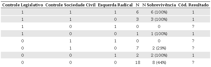 Algumas ressalvas são necessárias antes de prosseguirmos à interpretação. Em primeiro lugar, note que das quatro combinações que se associam a 100% de casos de sobrevivência do partido no poder Executivo, uma delas se baseia em apenas um caso (1-0-0) e outra em apenas dois (0-0-1). O baixo número de casos para certas combinações não tende a ser considerado um problema capaz de desqualificar conclusões alcançadas através da metodologia ACQ, pois trata-se de um método apropriado justamente para amostras pequenas. Em segundo lugar, observe que para duas combinações de valores (1-0-1 e 0-1-1), não há nenhum caso na amostra. Para estas combinações hipotéticas não é possível arriscar qualquer previsão com relação ao efeito esperado. Em terceiro lugar, para as duas combinações restantes (0-1-0 e 0-0-0), os resultados são contraditórios e também não nos permite determinar se promovem ou não a sobrevivência do governo. Podemos afirmar com segurança, entretanto, que as variáveis independentes combinadas assim não garantem esta sobrevivência, o que é, por si só, um achado de grande importância substantiva. 14 Incerteza, alternância de poder e riscos para a sobrevivência do governo após disputas eleitorais é, via de regra, considerada uma virtude democrática. Finalmente, note também que nenhuma combinação de valores promove necessariamente a derrota eleitoral do governo, isto é, a tabela não apresenta combinações de valores que levam sempre a este resultado.