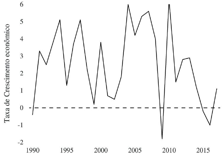 Este trabalho analisa dados do evento em que o risco de queda do chefe de governo é maior em um regime democrático presidencialista: a eleição presidencial. Para explicar diferenças nas capacidades de sobrevivência dos líderes políticos latino-americanos, foram analisadas todas as trinta e sete eleições presidenciais que ocorreram nas dezoito democracias presidencialistas do continente entre 2009 e 2017. 5 Com exceção da Venezuela em 2013, todas estas eleições foram realizadas no momento previsto pelo calendário eleitoral, com frequência variando de quatro a seis anos. 6 O número de observações para cada caso foi de uma para o México e Paraguai, três para o Chile, Equador e Honduras e duas para os outros treze países. Note que, embora o curto período de análise restrinja a quantidade de observações do banco de dados, temos a vantagem de desconsiderar os anos de forte crescimento provocado pelo “boom das commodities” e focar num momento de economia mais instável. Como mostra a Figura 1, a taxa média de crescimento da América Latina foi negativa em três dos nove anos analisados (2009, 2015 e 2016), algo que não acontecia desde 1990. A maioria dos países da amostra experimentou pelo menos um ano de recessão ou de forte redução da taxa de crescimento logo após a crise global de 2008. A única exceção é a Bolívia, que manteve altas taxas de crescimento em todo o período. Assim, a restrição temporal ajuda a reduzir a influência de variáveis omitidas potencialmente importantes para explicar o sucesso eleitoral de chefes de governo, como o bom desempenho econômico. 7