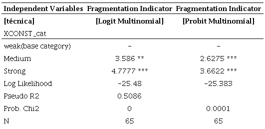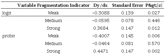 Table 10 shows the marginal effects after the multinomial logit model, where it can be seen that the increase of one unit (standard deviation) in the fragmentation indicator, there is a 36,84% probability of having a strong constraint from the Judiciary over the Executive. In the probit model, the marginal effects are practically the same. There is a greater likelihood of a strong constraint compared to a weak one, when increasing a unit in the independent variable.