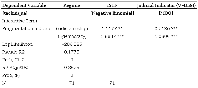 The regime variable (1 = democracy, 0 = dictatorship) was used only to measure the effect of party-political fragmentation on judicial empowerment in the different types of regime faced by Brazil. Thus, the interactive term was created from the independent variable that was shown to be statistically significant in all of the above models, so we opted for the fragmentation indicator (FragFac). The results of the fragmentation and regime interaction are shown in the Table 11.