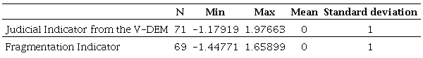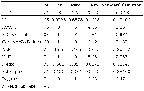 Thus, both NEP and NMP will be considered independent variables and used separately, since there is a strong correlation between them, which generates multicollinearity if they are present in the same model. In addition to these variables, we also use others based on Linzer & Staton 2015 and some from the Varieties of Democracy (V-DEM) dataset. The relationships between variables are described below. The first four variables are dependent, the first being the iSTF indicator followed by Linzer & Staton 2015 variables. The variables after the NEP are the independent ones and seek to measure political party fragmentation (NEP, NMP, F, Polyarchy and Political Competition). These last two were extracted from the Varieties of Democracy (V-DEM) dataset for the years under analysis. Regime is a binary variable measured to determine democratic (1) and authoritarian (0) periods, facilitating the creation of interactive terms capable of showing the marginal effect of political and party fragmentation in such periods. The iSTF synthetic indicator measures the number of prerogatives that the Federal Supreme Court has had over time, ranging from diffuse control of constitutionality to the concentrate, through the number of actors that can trigger such a judicial review mechanism, as well as by the authorities subject to Supreme Court, seeking to measure its institutional power 17. The variable LJI 18 stands for Latent Judicial Independence and seeks to measure a unified measure for two hundred countries from 1948 to 2015 ( Linzer & Staton 2015, p. 224). The XCONST variable is based on the Polity IV project and was designed to measure the extent to which decisions constrain the executive’s discretionary power ( Linzer & Staton 2015, p. 226). For statistical purposes, we recalculate this variable and create the variable XCONST_cat, an ordinal variable of three categories: weak (0 to 2), medium (3 and 4) and strong (5 and 6). The Polyarchy variable 19 (v2x_polyarchy) is an indicator that measures five components: “elected incumbents”, “free and fair elections”, “freedom of expression”, “freedom of association” and “inclusive citizenship” (Teorel et. al. 2016, p. 2). It is intuitive to say that the higher the level of Polyarchy, the greater the level of political competition, and the greater the level of uncertainty due to party fragmentation, leading to judicial empowerment as a way of guaranteeing the limits of the political game. Finally, we used an exclusive variable for political competition (e_polcomp) from the V-Dem dataset ( Coppedge et. al. 2017a ). The following tables ( Table 1) show the statistical descriptions of the variables used.
