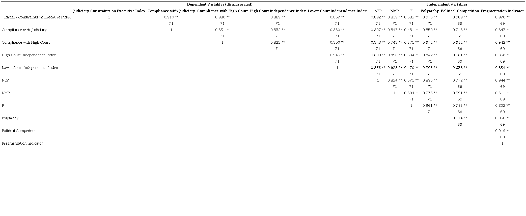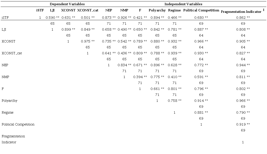 The period of anylisis is from 1945 to 2015, with the exception of Linzer & Staton (2015) variables, which are only available from 1948 to 2015, and the political competition variable, from V-DEM, which begins in 1946. In addition to the variables described in Table 2, we also used others from the V-Dem dataset, such as the Judicial Constraints on Executive Index (v2x_jucon) as well as the variables used for its calculation such as compliance with judiciary (v2jucomp), compliance with high court (v2juhccomp), high court Independence index (v2juhcind), and lower court Independence index (v2juncind). These indicators also measure the strength of the Judiciary. It was necessary to measure the relationship that the variables have among themselves, in order to avoid multicollinearity problems and to evaluate the use of a factor analysis to use transformed variables in order to reduce the number of variables used. On the next tables are the correlation matrices between the variables ( Tables 2 e 3).