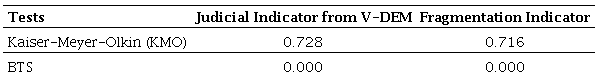 For the test of the factorized variable V-Dem Judicial Index, two variables were statistically important: NMP and polyarchy. It means that the increase of one unit in these variables increases by 0,1480 and 2,1717 standard deviations in the dependent variable, respectively. The fragmentation indicator, on the other hand, produces an increase of 0,9247 standard deviation. Then the test for the variable XCONST categorized in 3 levels.