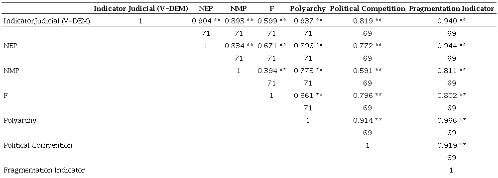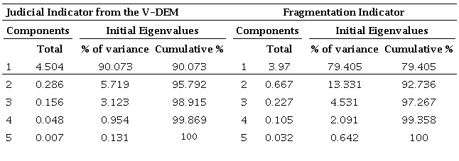 The first five variables were collected from the Varieties of Democracy (V-DEM) dataset for the period 1945-2015, measuring independence and judicial strength in constraining the Executive. As they are extremely correlated with each other, it is more appropriate to reduce them to a single factor through factor analysis. We will call this unique factor the Judicial Indicator from V-DEM. In the other independent variables (NEP, NMP, F, Polyarchy and Political Competition), which have already been previously explained, it is possible to verify an extremely high and significant correlation (except for the Fragmentation Indicator, which is the result of the factor analysis and carries a high load of variance of all other independent variables). In other words, the one-factor factorial analysis proved to be quite right to aggregate this information and facilitate a single model of ordinary least squares – OLS. The factor analysis is described in the table below.